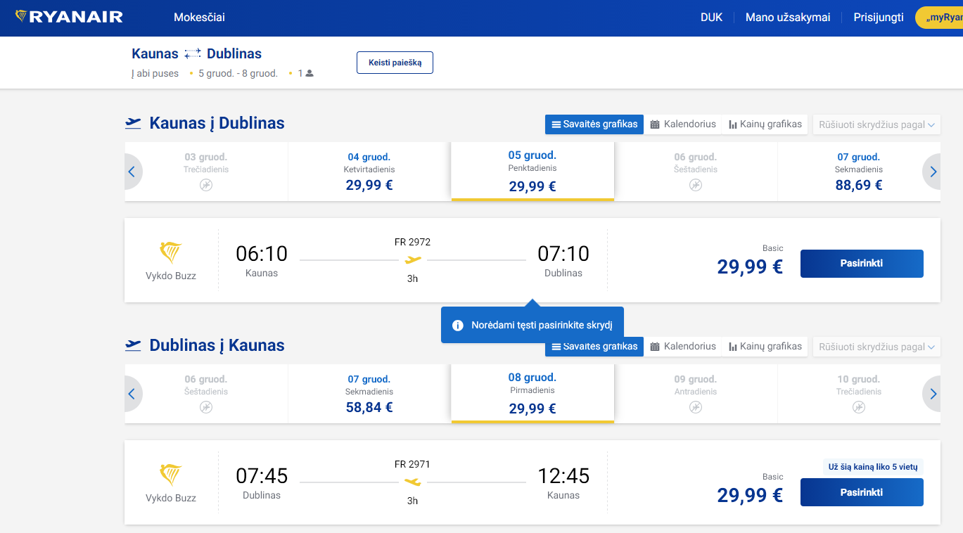 2025.11.10 rasta kaina: Kaunas – Dublinas (Airija). Ryanair pigus skrydis, kaina vienam žmogui €59,98 į abi puses. Skrydis 2025 m. gruodžio mėn. Trukmė – 3 naktys.
