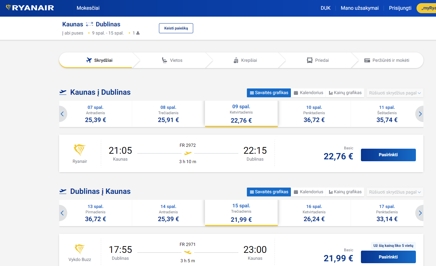 2025.09.26 rasta kaina: Kaunas – Dublinas (Airija). Ryanair pigus skrydis, kaina vienam žmogui €44,75 į abi puses. Skrydis 2025 m. spalio mėn. Trukmė – 6 naktys.