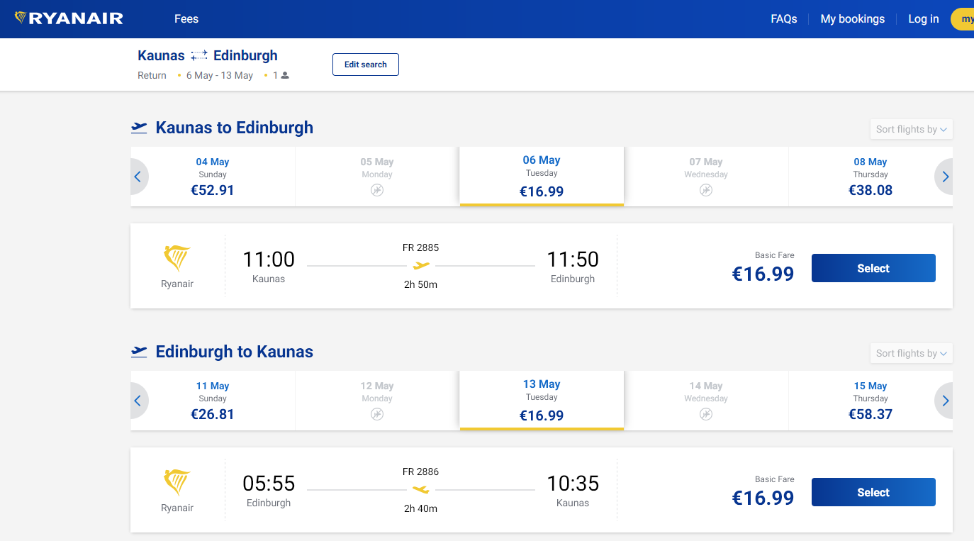 2025.04.28 rasta kaina: Kaunas – Edinburgas (Škotija). Ryanair pigus skrydis, kaina vienam žmogui €33,98 į abi puses. Skrydis 2025 m. gegužės mėn. Trukmė – 7 naktys.