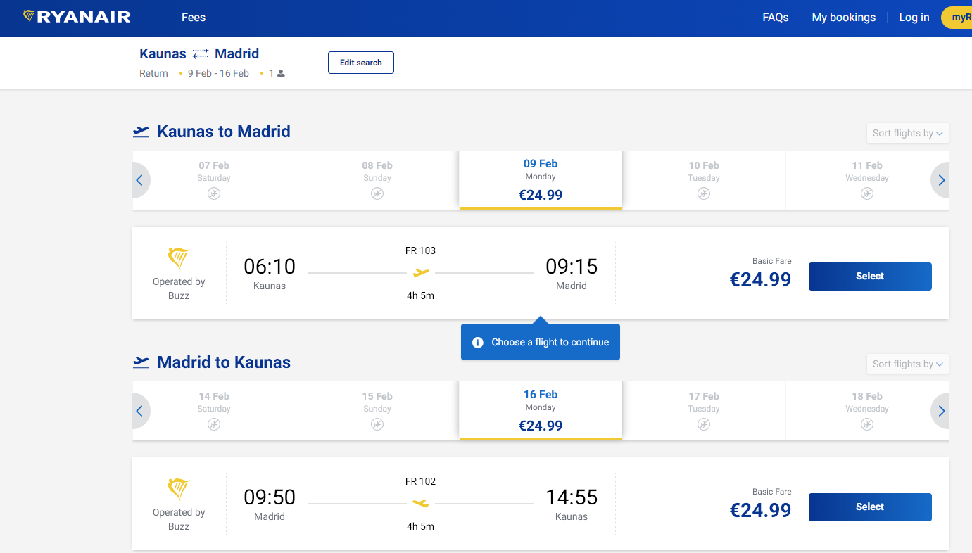 Šiuo metu esančią pigiausią skrydžio Kaunas – Madridas kainą, galite pasitikrinti čia: Kaunas Madridas ryanair skrydžiai