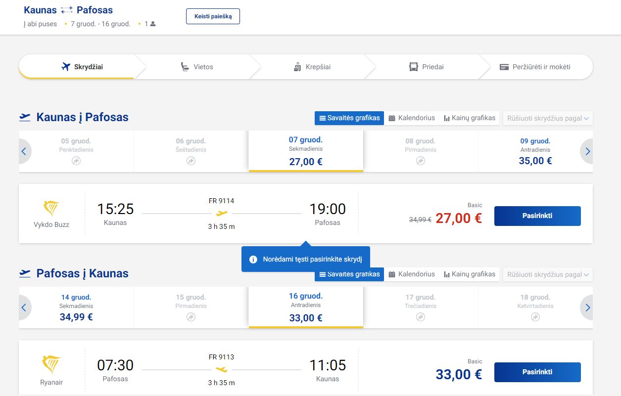 2025.09.25 rasta kaina: Kaunas – Pafosas (Kipras). Ryanair pigus skrydis, kaina vienam žmogui €60 į abi puses. Skrydis 2025 m. gruodžio mėn. Trukmė – 9 naktys.