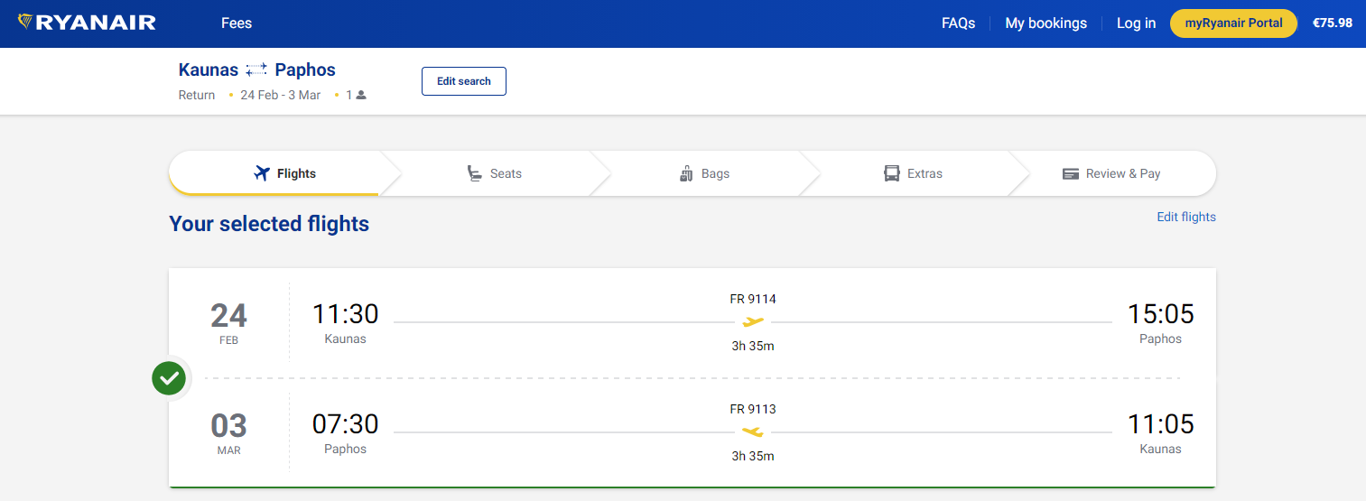 2025.10.21 rasta kaina: Kaunas – Pafosas (Kipras). Ryanair pigus skrydis, kaina vienam žmogui €75,98 į abi puses. Skrydis 2026 m. vasario mėn. Trukmė – 7 naktys.