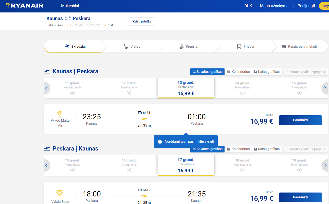 2025.11.03 rasta kaina: Kaunas – Peskara (Italija). Ryanair pigus skrydis, kaina vienam žmogui €33,98 į abi puses. Skrydis 2025 m. gruodžio mėn. Trukmė – 4 naktys.