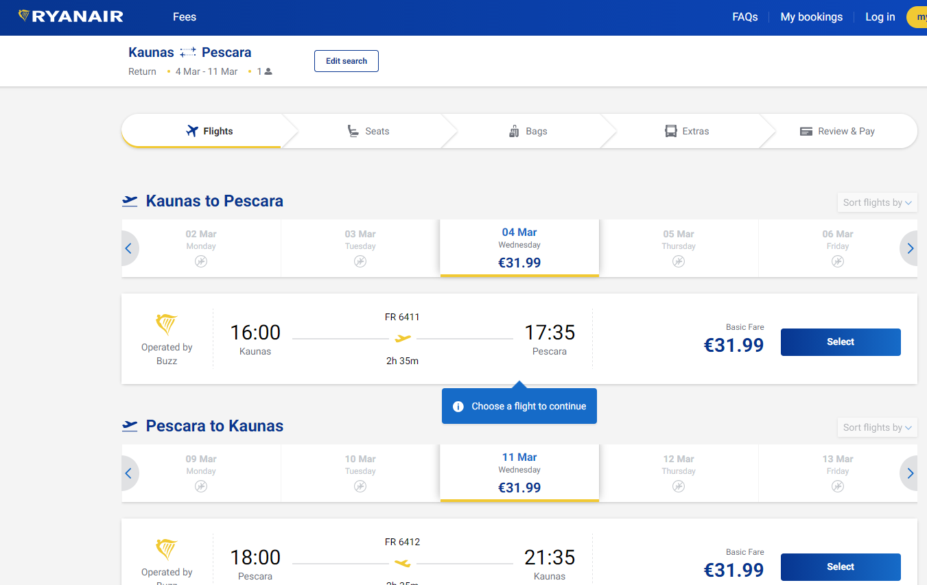 2025.12.11 rasta kaina: Kaunas – Peskara (Italija). Ryanair pigus skrydis, kaina vienam žmogui €63,98 į abi puses. Skrydis 2026 m. kovo mėn. Trukmė – 7 naktys.
