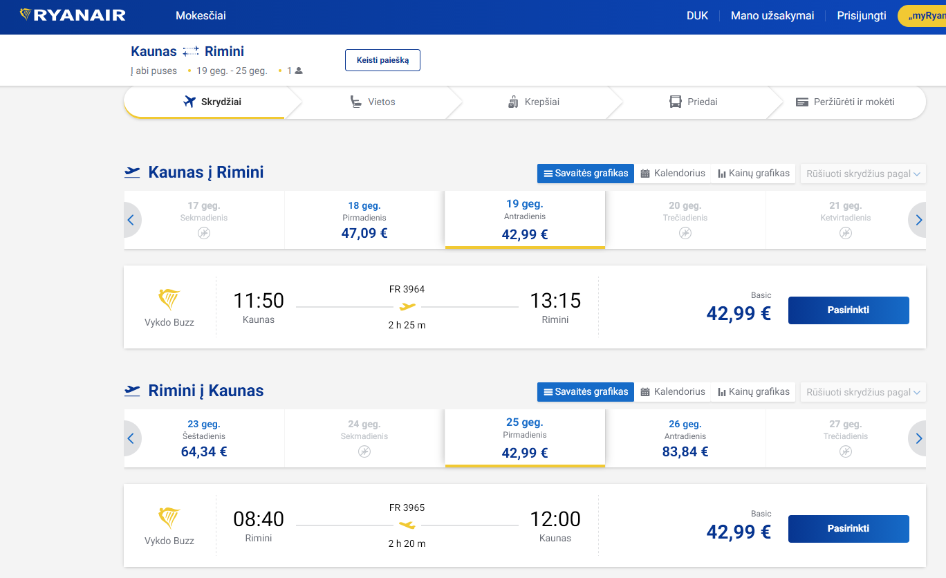 2025.12.16 rasta kaina: Kaunas – Riminis (Italija). Ryanair pigus skrydis, kaina vienam žmogui €85,98 į abi puses. Skrydis 2026 m. gegužės mėn. Trukmė – 6 naktys.