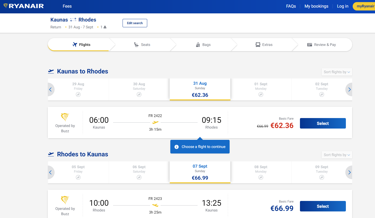 2025.04.01 rasta kaina: Kaunas – Rodas (Graikija). Ryanair pigus skrydis, kaina vienam žmogui €129,35 į abi puses. Skrydis 2025 m. rugpjūčio mėn. Trukmė – 7 naktys.