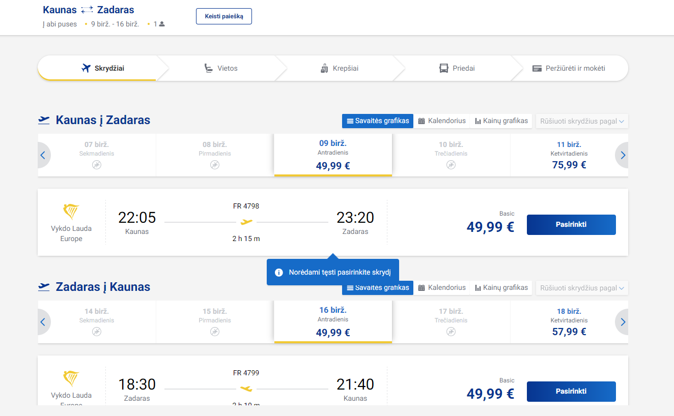 2025.09.26 rasta kaina: Kaunas – Zadaras (Kroatija). Ryanair pigus skrydis, kaina vienam žmogui €99,98 į abi puses. Skrydis 2026 m. birželio mėn. Trukmė – 7 naktys.