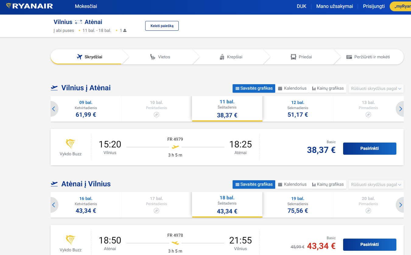 2026.02.09 rasta kaina: Vilnius – Atėnai (Graikija). Ryanair pigus skrydis, kaina vienam žmogui €81,71 į abi puses. Skrydis 2026 m. balandžio mėn. Trukmė – 7 naktys.