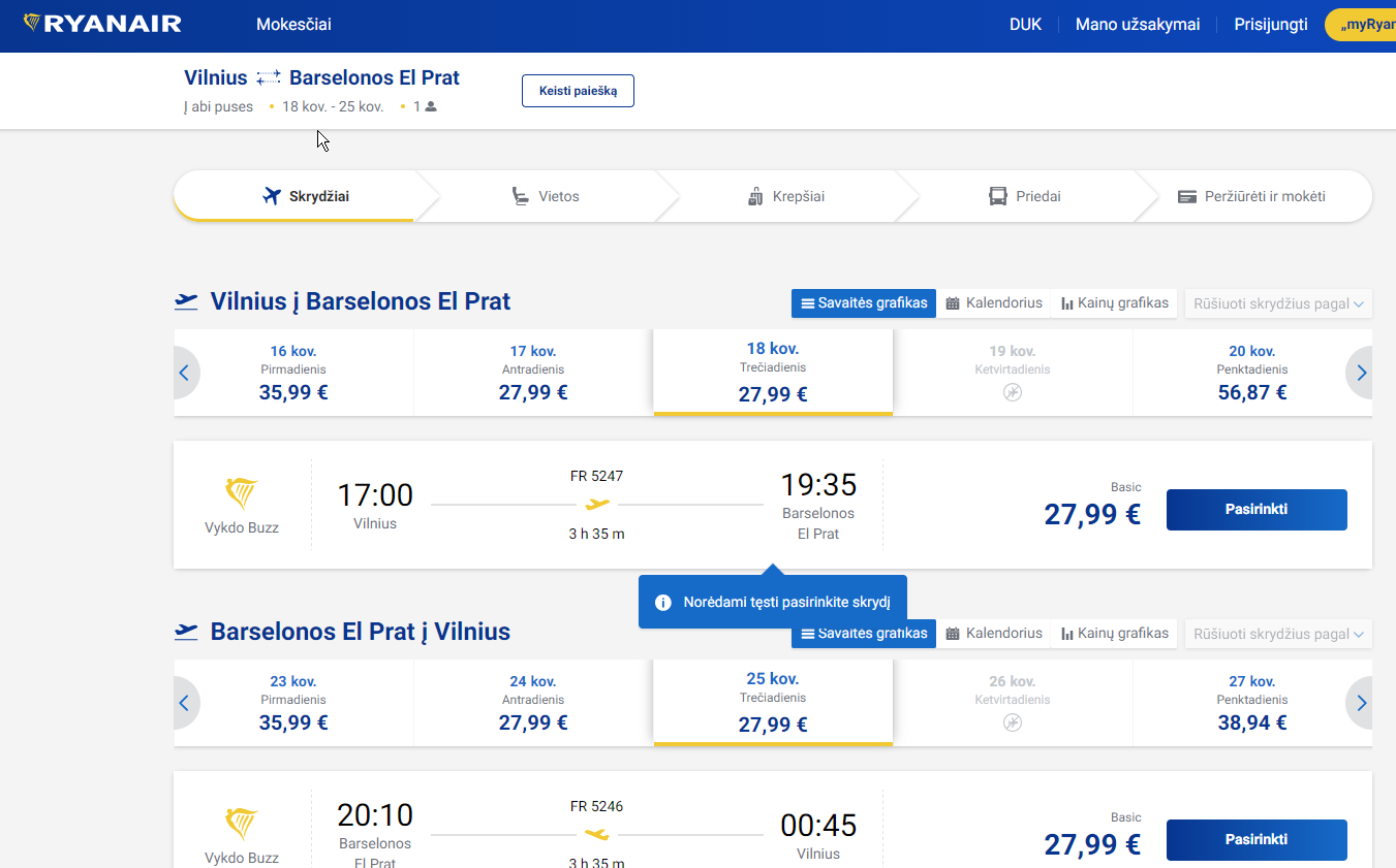 2025.12.28 rasta kaina: Vilnius – Barselona (Ispanija). Ryanair pigus skrydis, kaina vienam žmogui €55,98 į abi puses. Skrydis 2026 m. kovo mėn. Trukmė – 7 naktys.