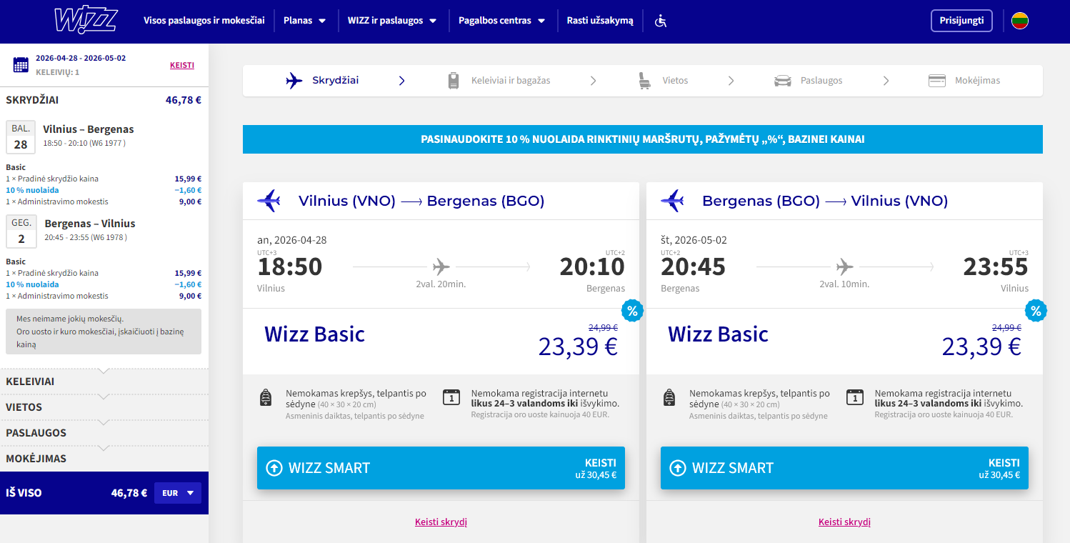 2026.02.21 rasta kaina: Vilnius – Bergenas (Norvegija). Ryanair pigus skrydis, kaina vienam žmogui €46,78 į abi puses. Skrydis 2026 m. balandžio mėn. Trukmė – 4 naktys.