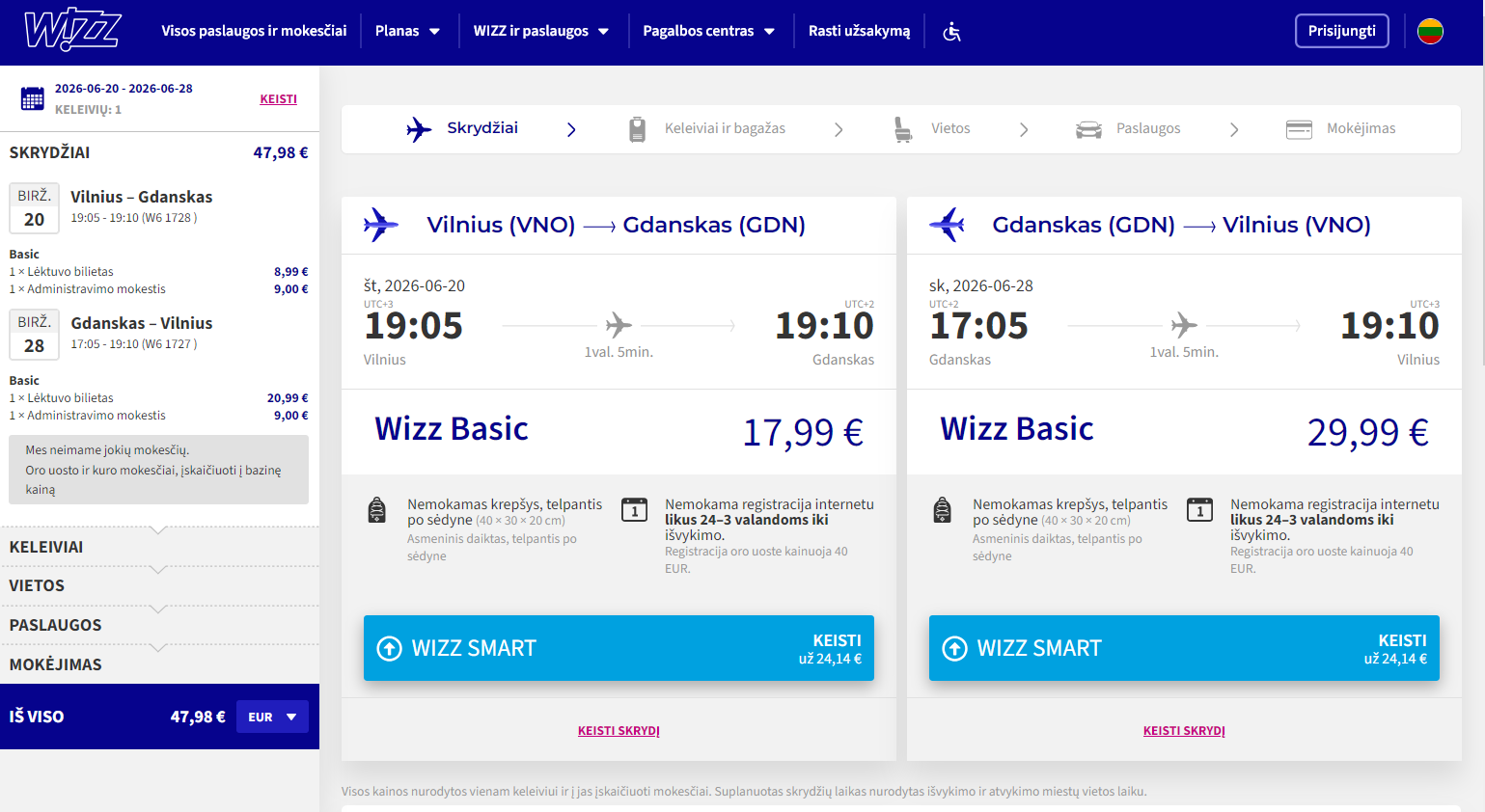 2025.10.26 rasta kaina: Vilnius – Gdanskas (Lenkija). Ryanair pigus skrydis, kaina vienam žmogui €47,98 į abi puses. Skrydis 2026 m. birželio mėn. Trukmė – 8 naktys.