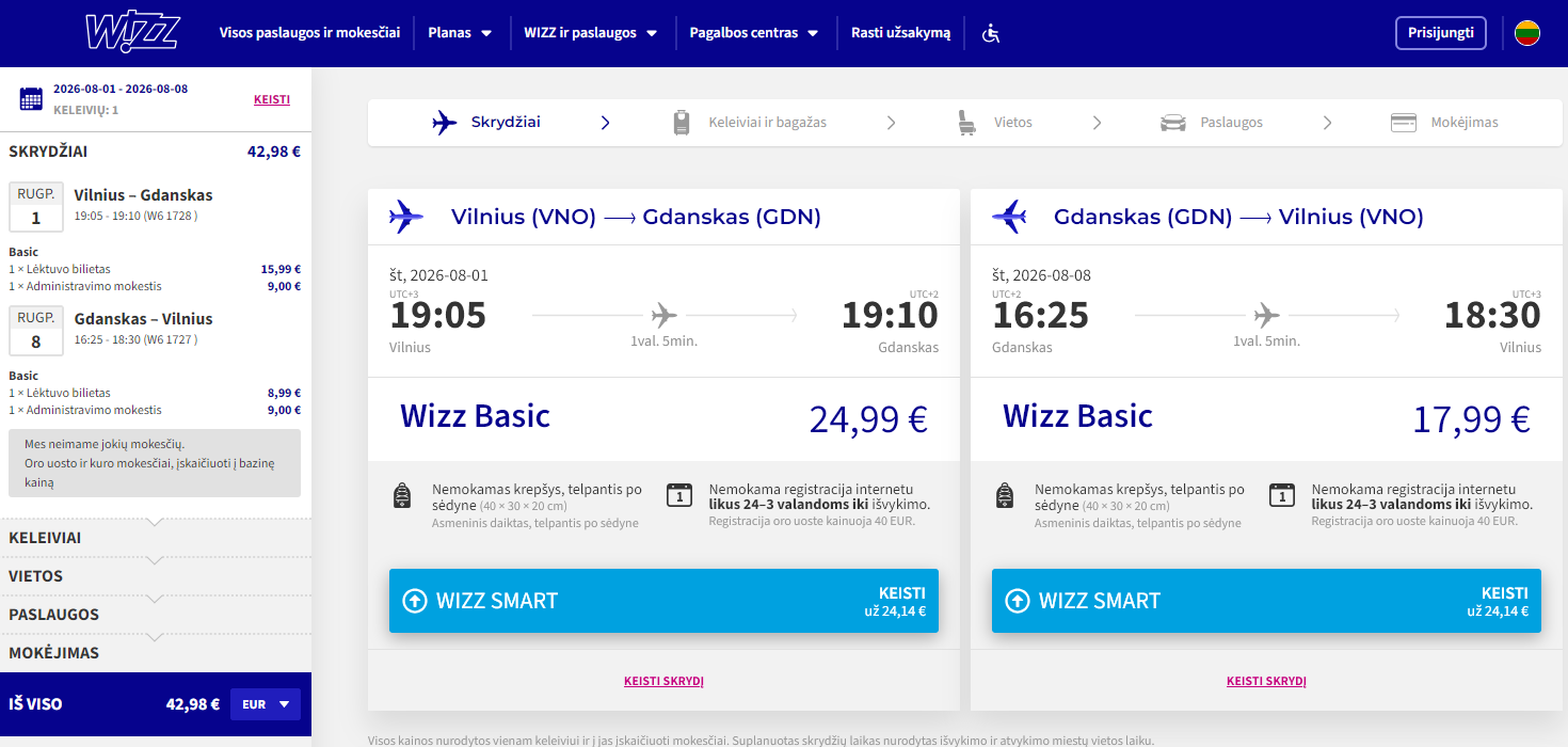 2026.02.06 rasta kaina: Vilnius – Gdanskas (Lenkija). Ryanair pigus skrydis, kaina vienam žmogui €42,98 į abi puses. Skrydis 2026 m. rugpjūčio mėn. Trukmė – 7 naktys.