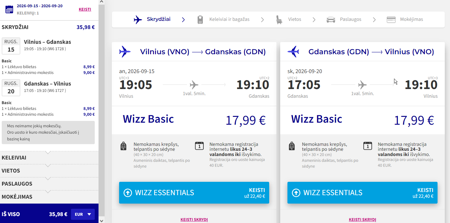 2025.10.07 rasta kaina: Vilnius – Gdanskas (Lenkija). Ryanair pigus skrydis, kaina vienam žmogui €35,98 į abi puses. Skrydis 2026 m. rugsėjo mėn. Trukmė – 5 naktys.