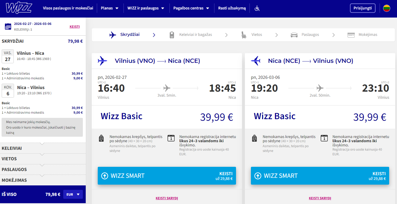 2025.11.03 rasta kaina: Vilnius – Nica (Prancūzija). Ryanair pigus skrydis, kaina vienam žmogui €79,98 į abi puses (€59,98 su WDC) . Skrydis 2026 m. vasario mėn. Trukmė – 7 naktys.