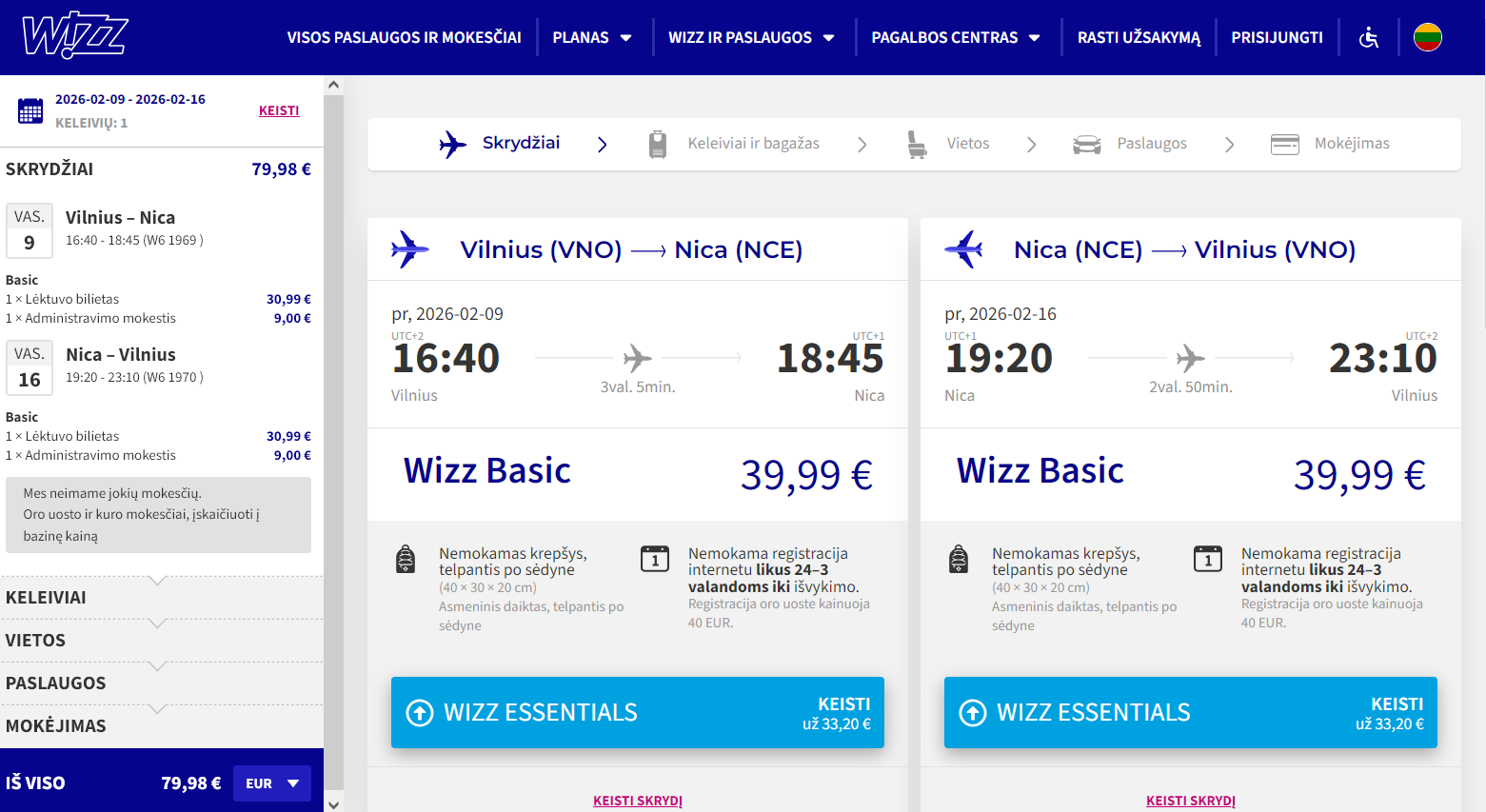 2025.09.29 rasta kaina: Vilnius – Nica (Prancūzija). Ryanair pigus skrydis, kaina vienam žmogui €79,98 į abi puses. Skrydis 2026 m. vasario mėn. Trukmė – 7 naktys.