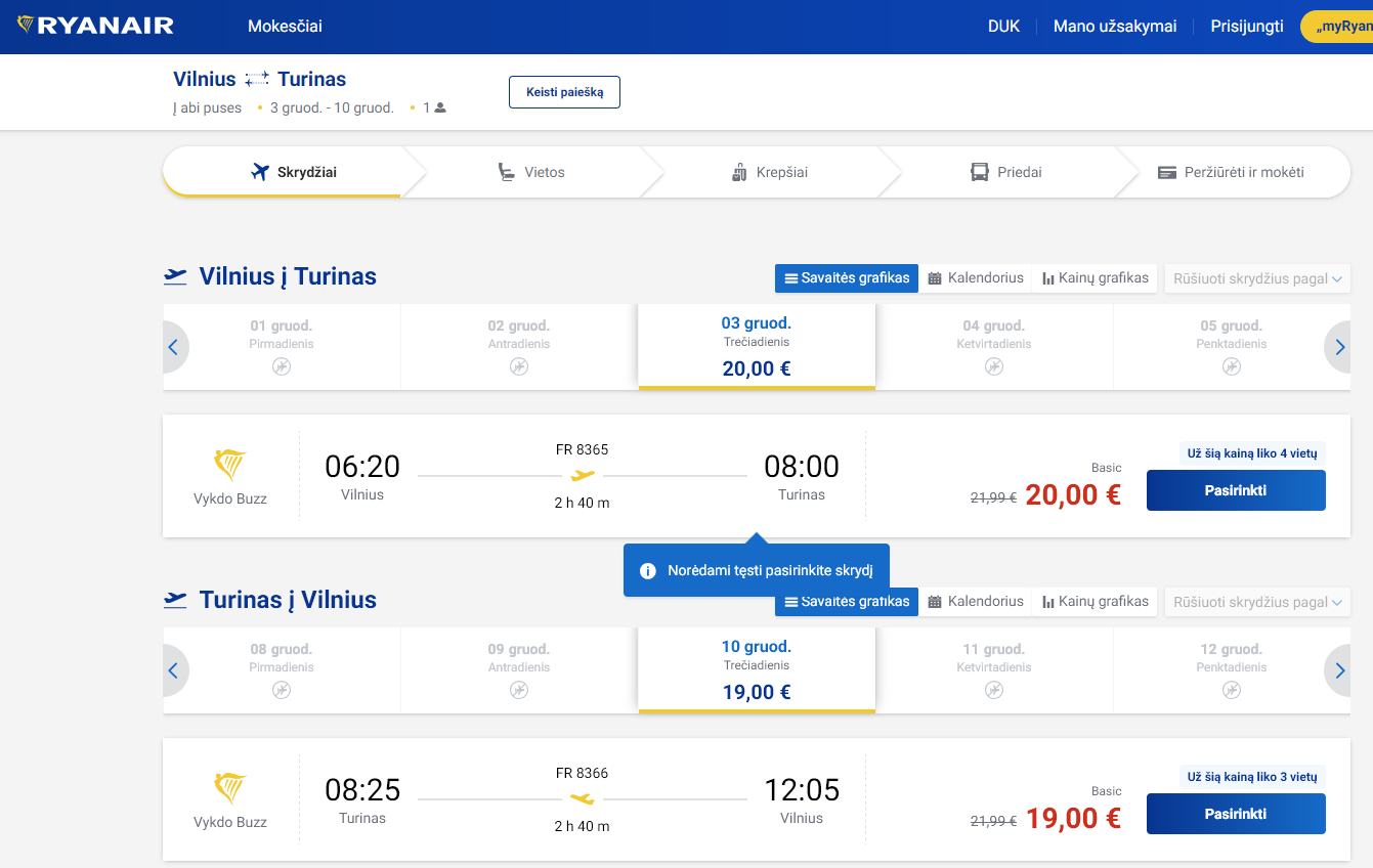 2025.10.13 rasta kaina: Vilnius – Turinas (Italija). Ryanair pigus skrydis, kaina vienam žmogui €39,00 į abi puses. Skrydis 2025 m. gruodžio mėn. Trukmė – 7 naktys.