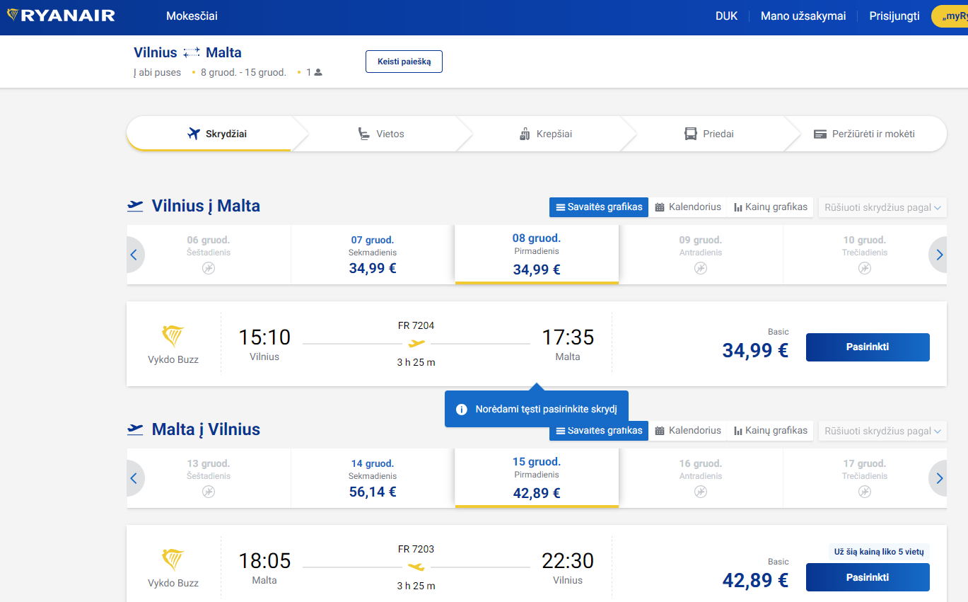 2025.09.21 rasta kaina: Vilnius – Valeta (Malta). Ryanair pigus skrydis, kaina vienam žmogui €77,88 į abi puses. Skrydis 2025 m. gruodžio mėn. Trukmė – 7 naktys.