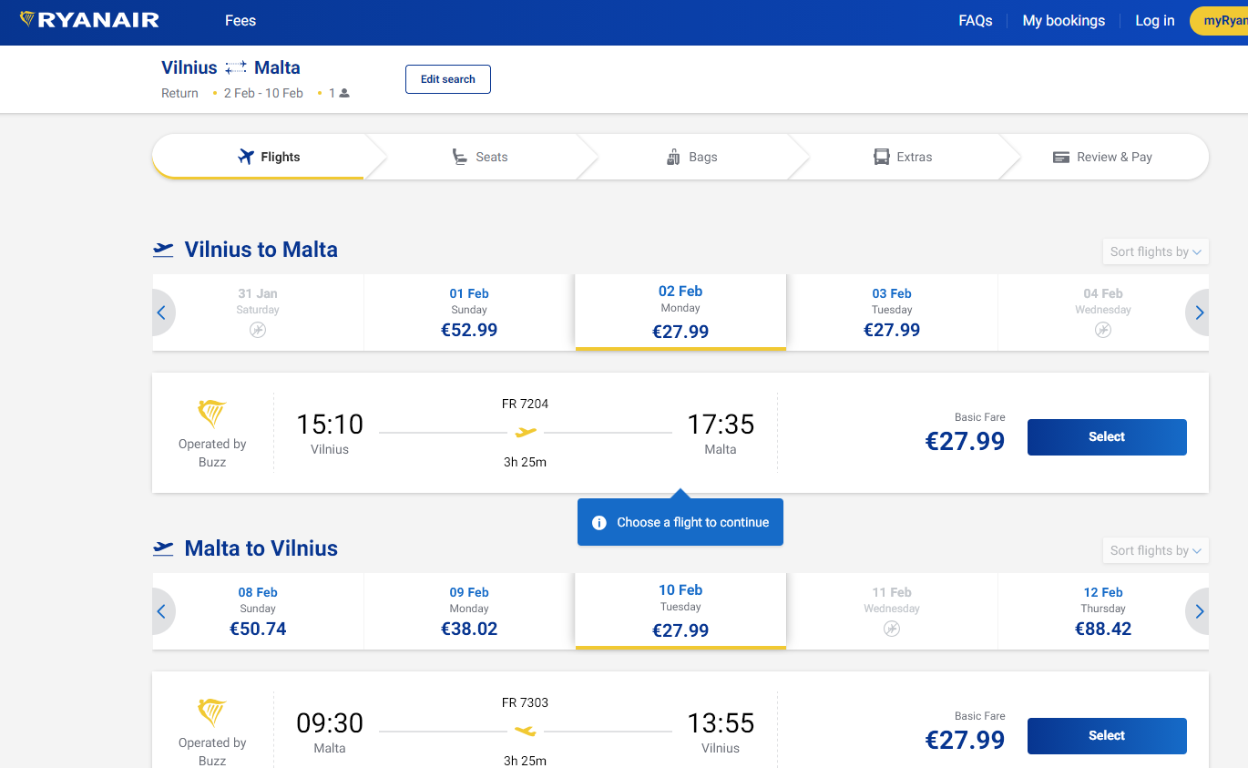 2026.01.02 rasta kaina: Vilnius – Valeta (Malta). Ryanair pigus skrydis, kaina vienam žmogui €55,98 į abi puses. Skrydis 2026 m. vasario mėn. Trukmė – 8 naktys.