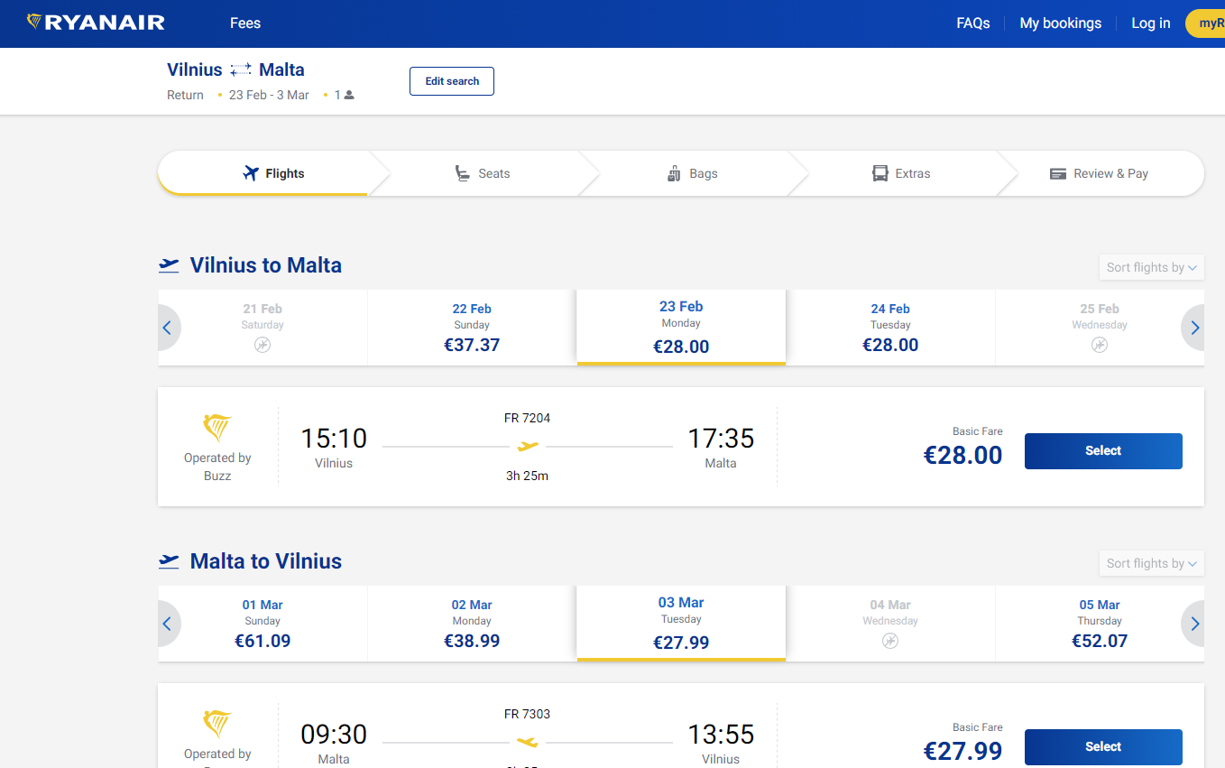 Šiuo metu esančią pigiausią skrydžio Vilnius – Valeta kainą, galite pasitikrinti čia: Tiesioginiai skrydžiai į Maltą