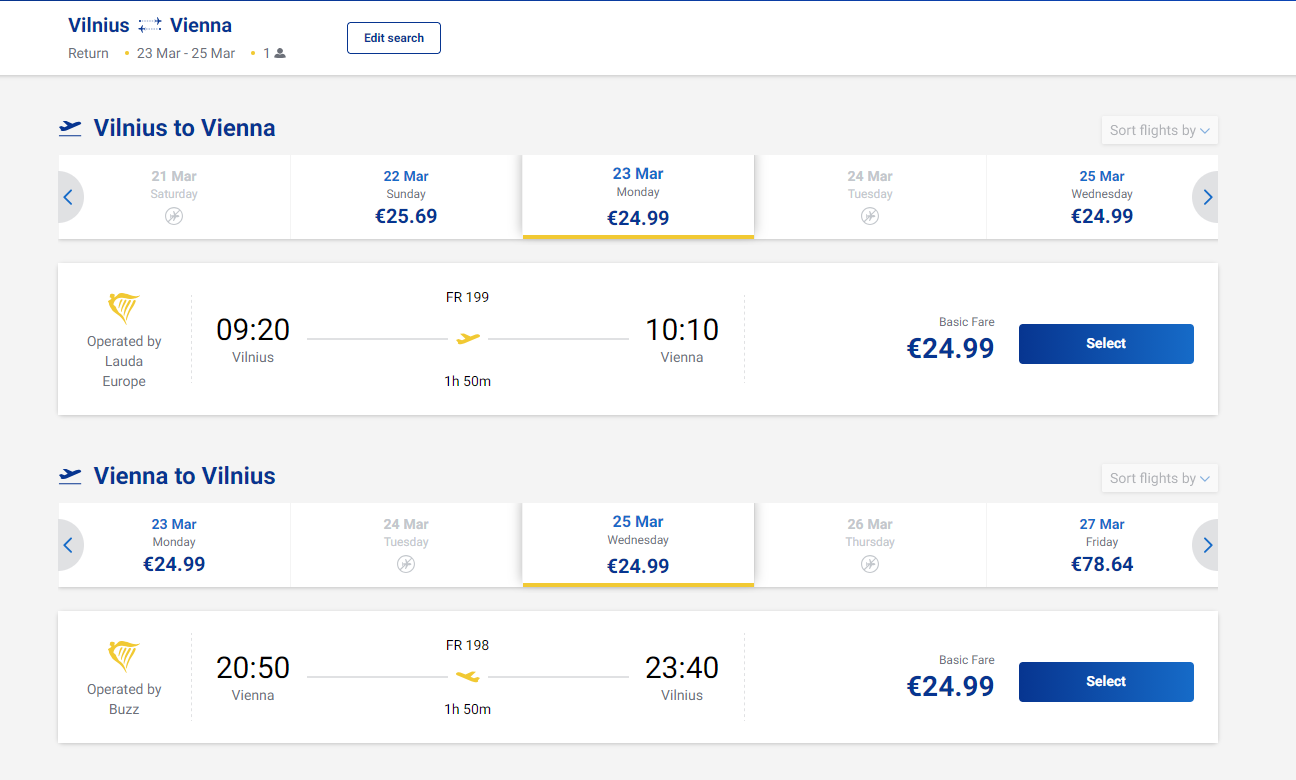 Šiuo metu esančią pigiausią skrydžio Vilnius – Viena kainą, galite pasitikrinti čia: Vilnius Viena Ryanair skrydžiai