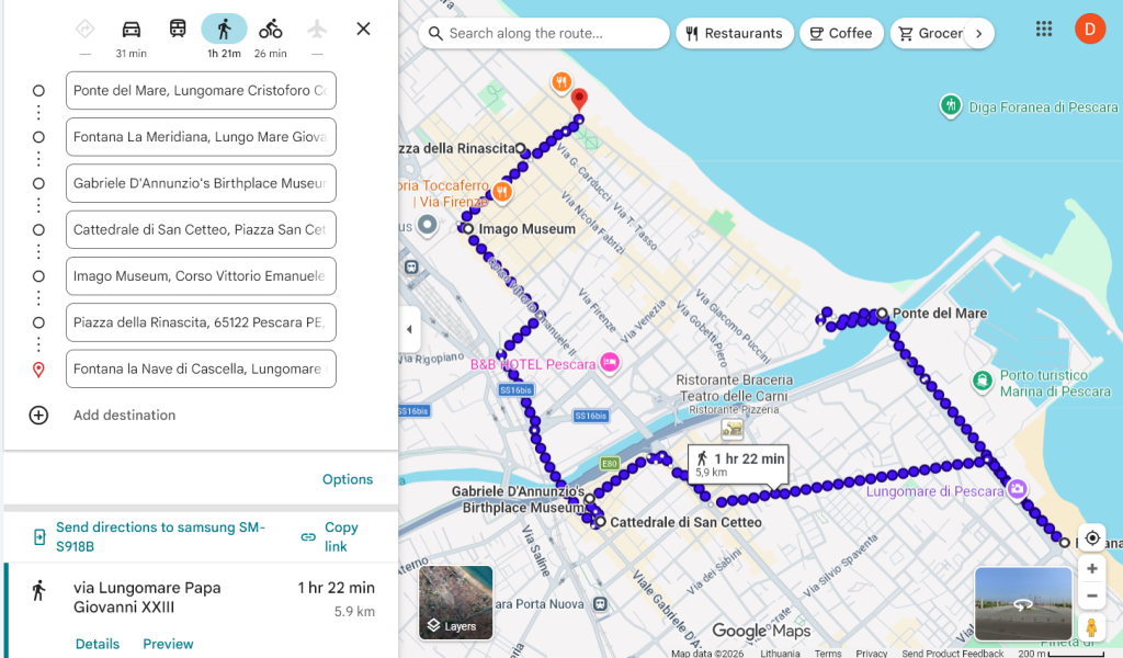 Aplankฤme Ortona, Silvi Paesi, Citta San Angelo, Chieti, Teramo. Visur traukiniais ir autobusais. Teramo pasirodฤ nevertas dฤmesio. Peskara verta dฤmesio tik dฤl barลณ ir paplลซdimiลณ.
