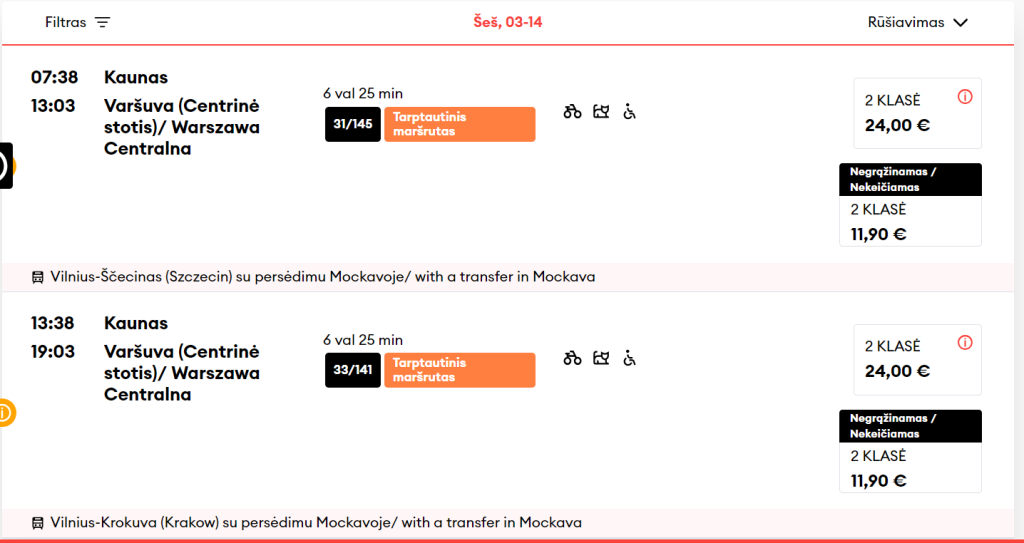 - Kaunas Varšuva traukinio kaina 11,90-24 EUR.